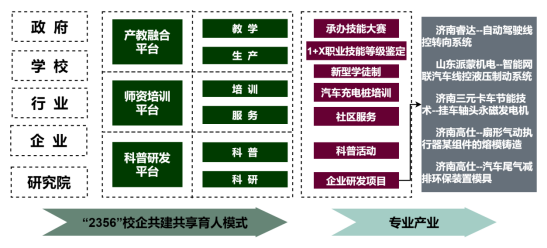 “2356”校企共建共享共成长模式来自于山东劳动职业技术学院和睿达企业的长期合作。自2009年合作至今,由最初简单的为睿达输送毕业生,睿达提供学生顶岗实习等,向订单班、政府批准的校企共建专业、学徒制培养、协同创新中心、教师工作站等融合式合作项目。经过多年探索、实践与创新,逐步形成了“两个主体、三个平台、五方聚力、六位一体”的 “2356”校企共建共享育人模式。该模式以赋能助力产业发展为导向,以培养“高素质、懂技术、善诊断、会经营”汽车人才为目标,服务中小微企业的技术研发和产品升级。通过校企双元两个主体,充分发挥政府、学校、行业、企业、研究所五方聚力的特点,基于“产教融合、师资培训、科普研发”三个平台,承接企业研发项目、社会培训、“1 x”职业技能等级鉴定、技能大