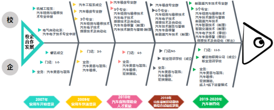 2017年与睿达联合申报山东省汽车检测与维修技术专业(汽车快修连锁经营与管理方向)校企共建专业(简称睿达班),打破以往校企合作停留于订单班、顶岗实习、参观学习等浅层面,由政府主导,配套有相应完善的校企合作制度和财政税收、补贴等方面的动力机制。睿达班学生既属于学校,又属于企业,校企联手专门制定人才培养方案,课程标准,开发睿达班专属教材。